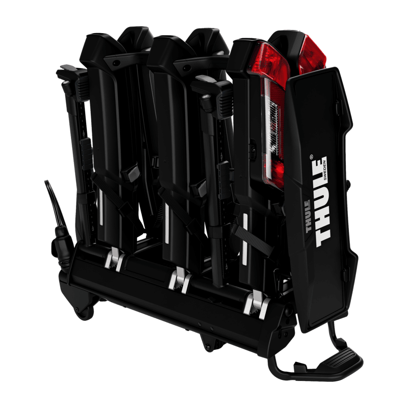 Facile et rapide à installer sur votre rotule d’attelage grâce à son levier de serrage verrouillable. Le Thule Epos 3 vous laissera l’accès à votre coffre grâce à son astucieux système de basculement intégré et judicieusement placé. Il est muni d’une prise électrique 13 broches. Grâce à son ingénieux système de barres de maintien escamotables, il est possible d’utiliser ce porte-vélos sur des véhicules munis d’une roue de secours sur hayon (exemple Jeep Wrangler) et ce sans le moindre accessoire supplémentaire ! La seule contrainte étant de devoir sacrifier l’emplacement du premier vélo.