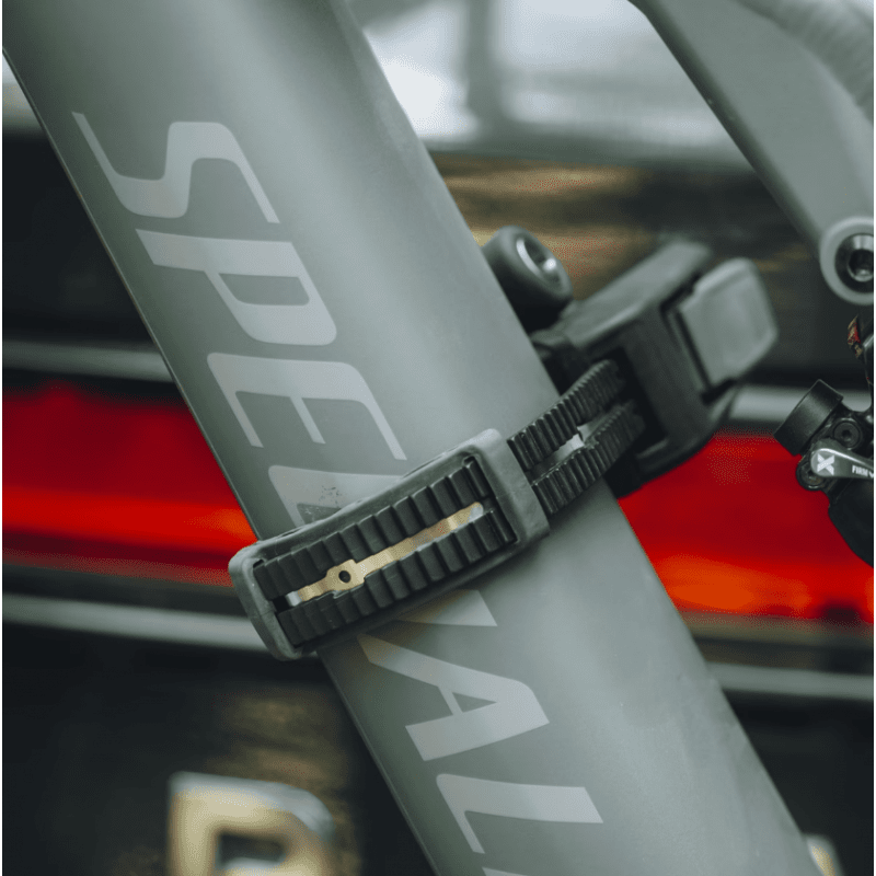 Les vélos sont fermement maintenus au niveau des roues par des courroies crantées résistantes et sur les cadres par des bras de fixation réglables dont les mâchoires sont verrouillables à clé. Un jeu de sangles disponibles en option (référence THU985000) permet de maintenir des roues larges de 11,90 cm.