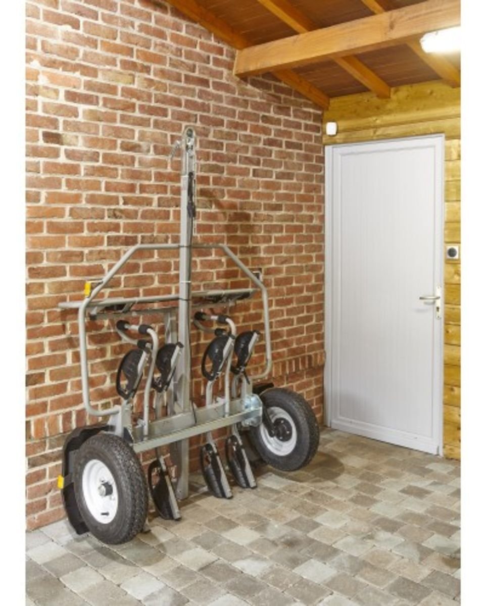L’arrière du timon est rabattable et permet donc un stockage vertical sans perdre de place : le rangement est donc possible au fond d’un garage !