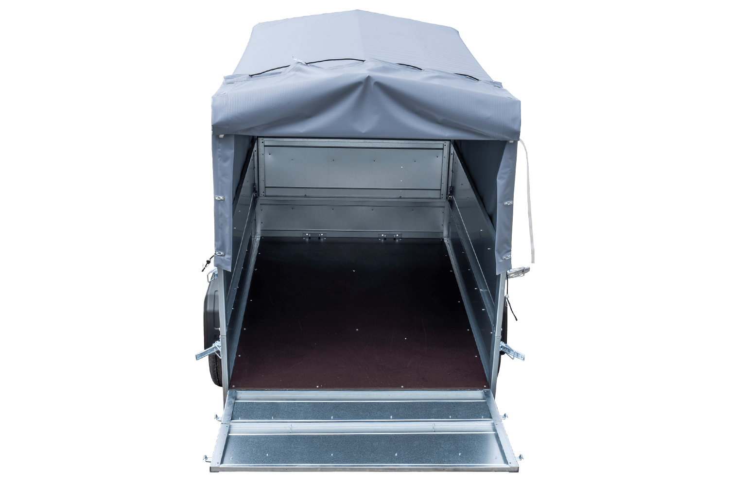 - CARROSSERIE – le cadre de la remorque en tôle acier galvanisée. Tôle profilée vissée. Espace de transport : plancher en contreplaqué étanche et antidérapant de 9 mm d’épaisseur.